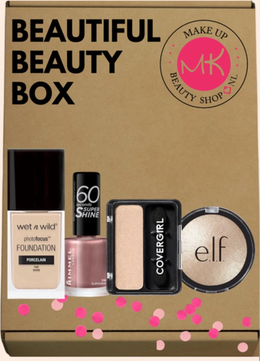 Deze Beautiful Mystery Beauty Box heeft onder andere items van de hippe make-up merken: Covergirl, Wet ‘n Wild, Rimmel London, e.l.f. Cosmetics, Hard Candy Makeup, Almay, Ardell, Jordana Cosmetics, Colormates, Black Radiance Makeup en Lip Smacker.