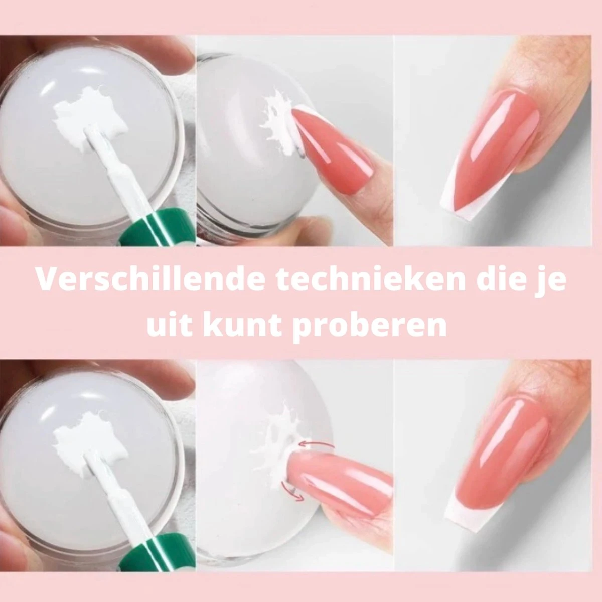 Duw de top van de nagel in de stempel voor mooie french nails. Voor een patroon op de nagel, lak een laagje over de stempelkaart en duw de nagelstempel erin, druk dit patroon daarna op de nagel.