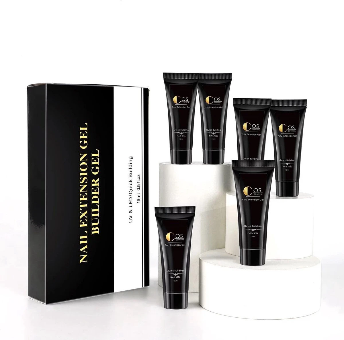 Een compacte polygel nagel extension set van Coscelia. Een volledig pakket met een gels, coats, accessoires en alle andere benodigdheden voor het zetten van goede nepnagels.
