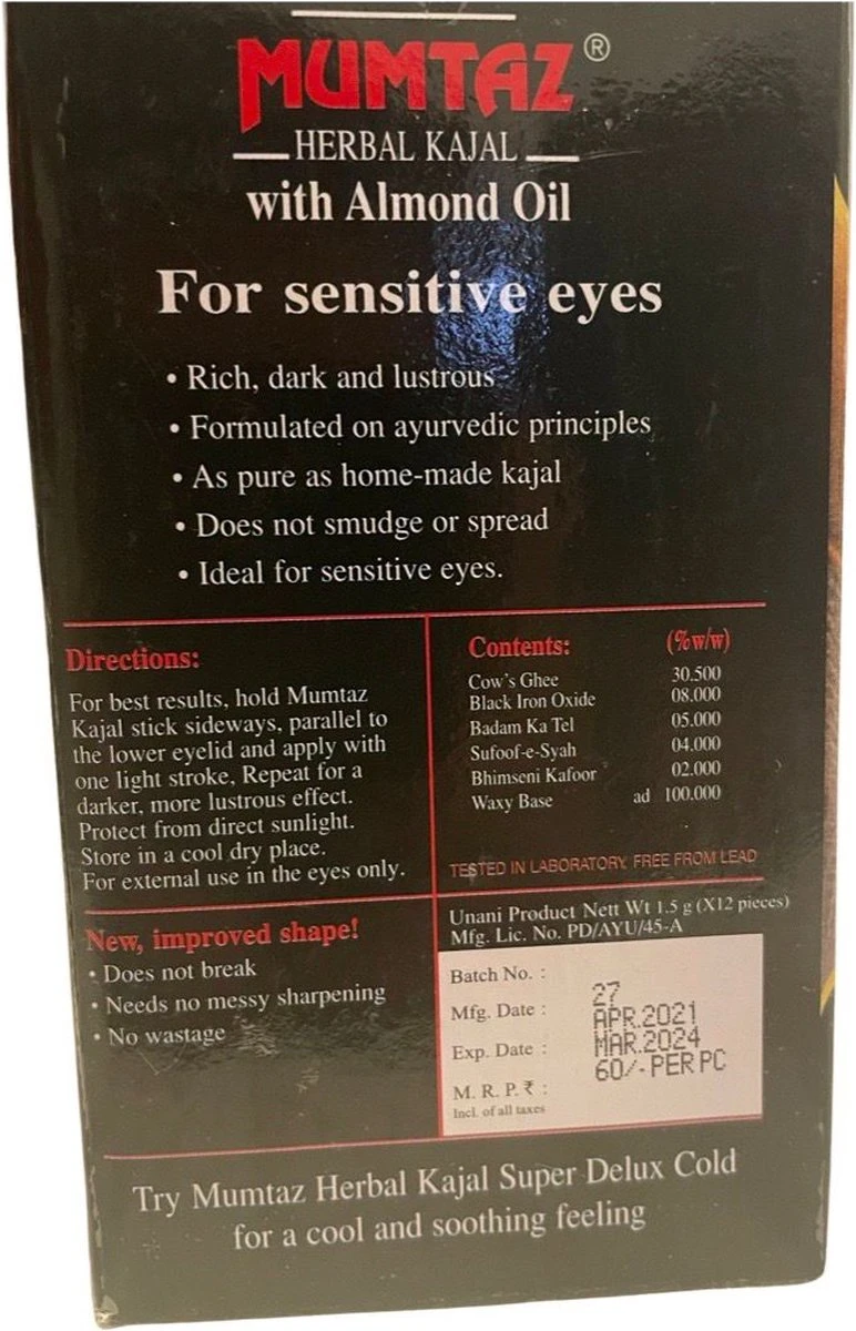 Heb jij vaak genoeg last van overgevoelige ogen bij het gebruik van de tegenwoordige oogpotloden en wens je graag toch te kunnen genieten van zwarte lijnen rondom de ogen? Of zet je graag die zwarte eyeliner voor een verleidende winged look en wens je de ogen extra expressie te geven? De GoodUse Export Mumtaz Herbal Kajal Stick geeft jou die adembenemende exotische look! En wel op een natuurlijke wijze.