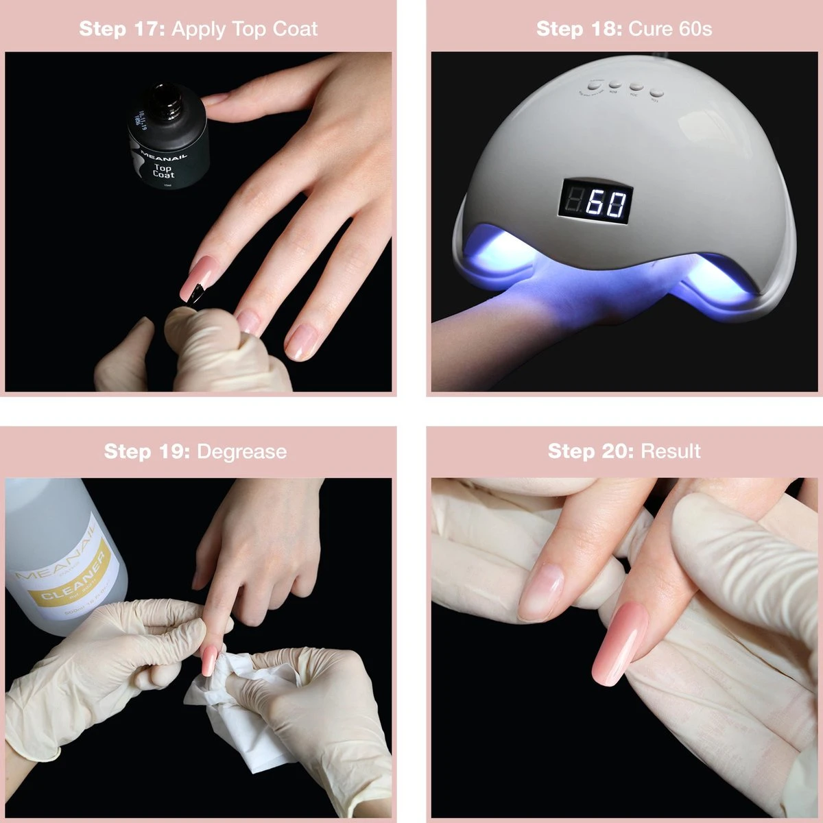 5 – Uitharden gedurende 30/60 seconden onder een UV/LED lamp en altijd blijven duwen op de kunstnagel totdat u voelt dat de kunstnagel goed vast zit.