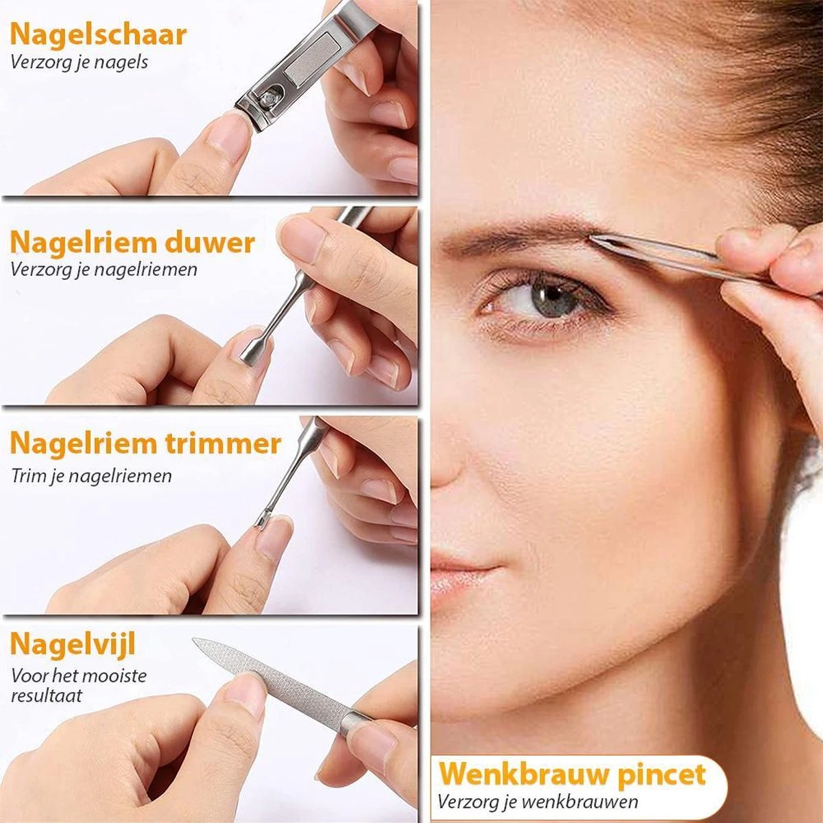 In de manicure- en pedicureset vind je alles wat je nodig hebt voor mooie, gezonde en verzorgde nagels. Zo bevat het setje een vijl, verschillende nagelknippers en meerdere producten om de nagelriemen te verzorgen. Dankzij het roestvrijstalen ontwerp hebben de items een lange levensduur en kun je ze gewoon reinigen met water. Met de luxe manicure- en pedicureset behoren onverzorgde nagels tot het verleden.
