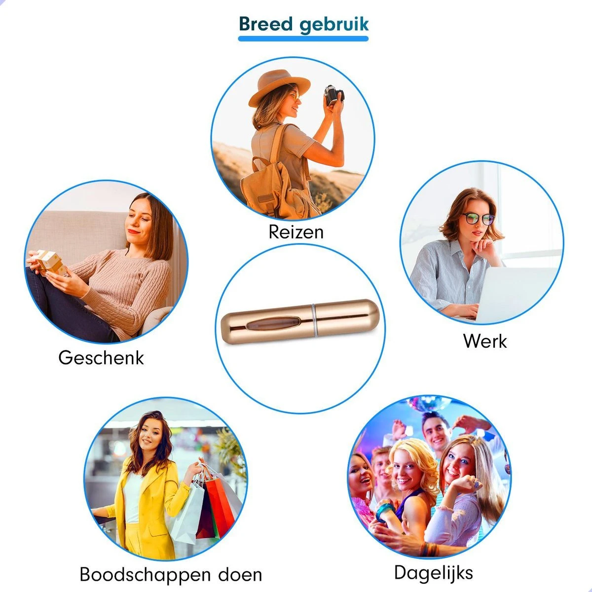 Met deze handige en navulbare parfum spray kun je al je favoriete parfums met je meenemen! Het flesje kan maximaal 5 milliliter parfum bevatten. Je vult je flesje eenvoudig door onderaan het flesje je favoriete parfum te vullen.