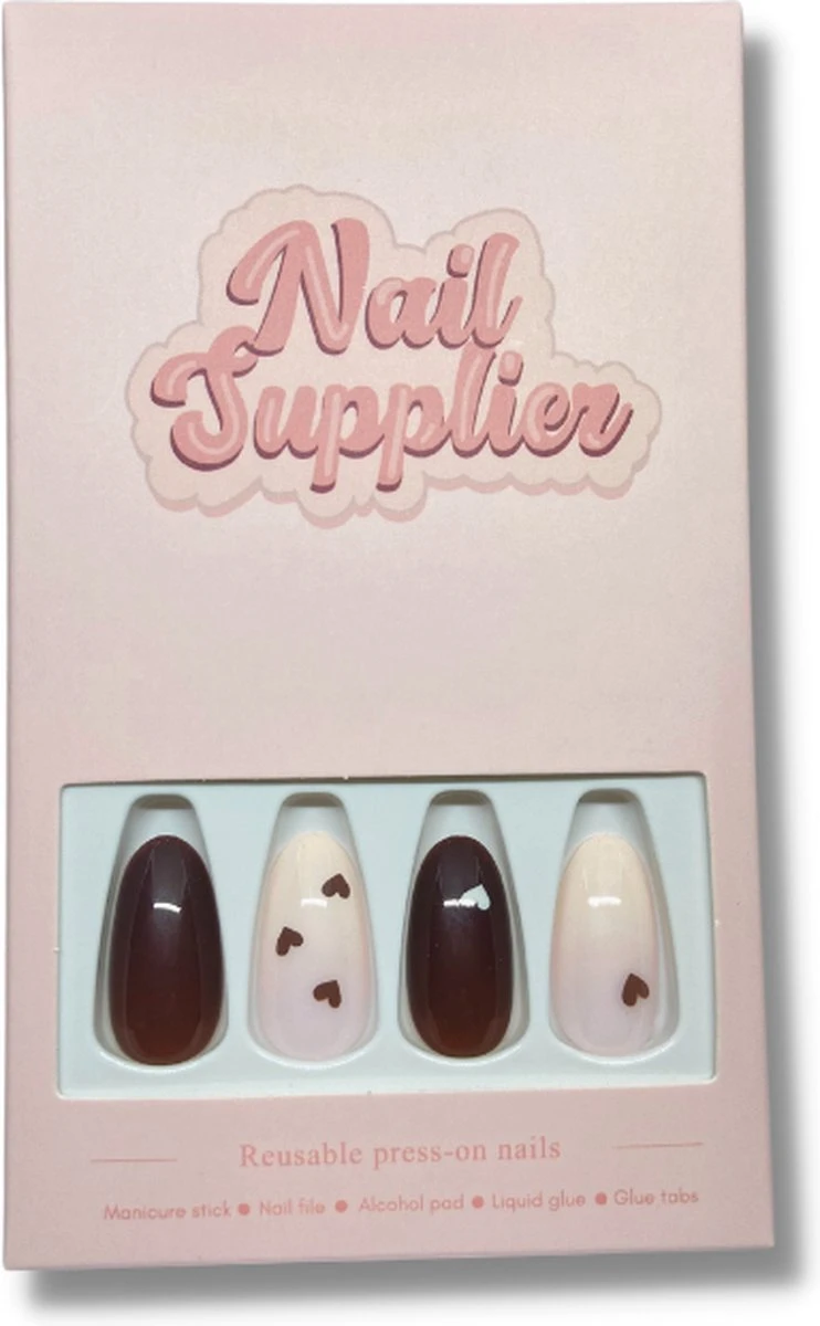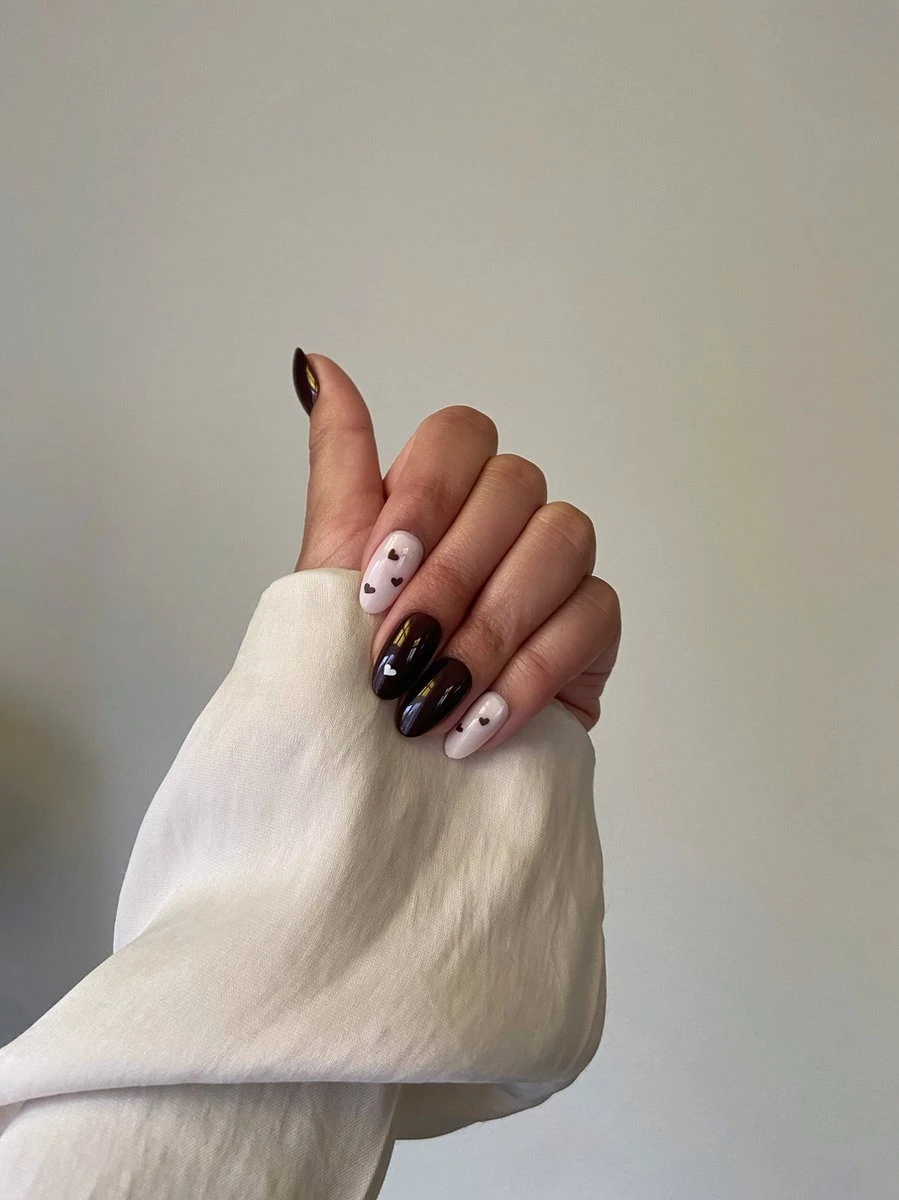 De Hot Chocolate is speciaal voor degenen die zich graag in de gezellige sfeer bevinden. De set bevat donkebruine en wit/rozige nagels. Sommigen zijn gedecoreerd met kleine hartjes.