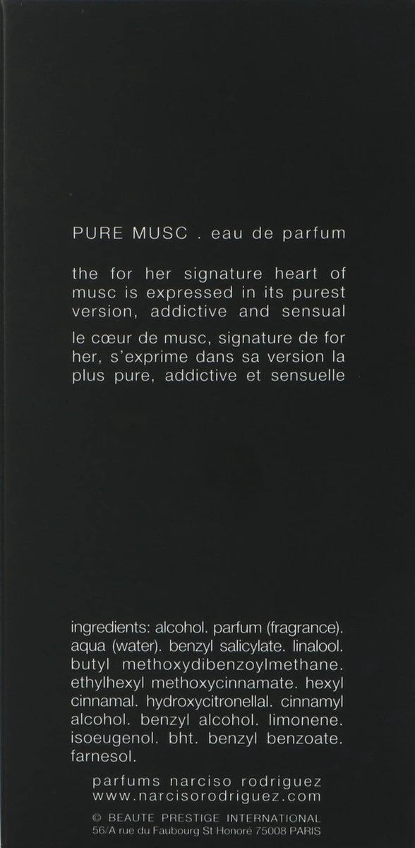 Pure Musc van Narciso Rodriguez is een sensuele diepe geur. Rond de hartnoot van muskus bloeit een boeket van jasmijn en sinaasappelbloesem. Een bloemig parfum met een puur hart.