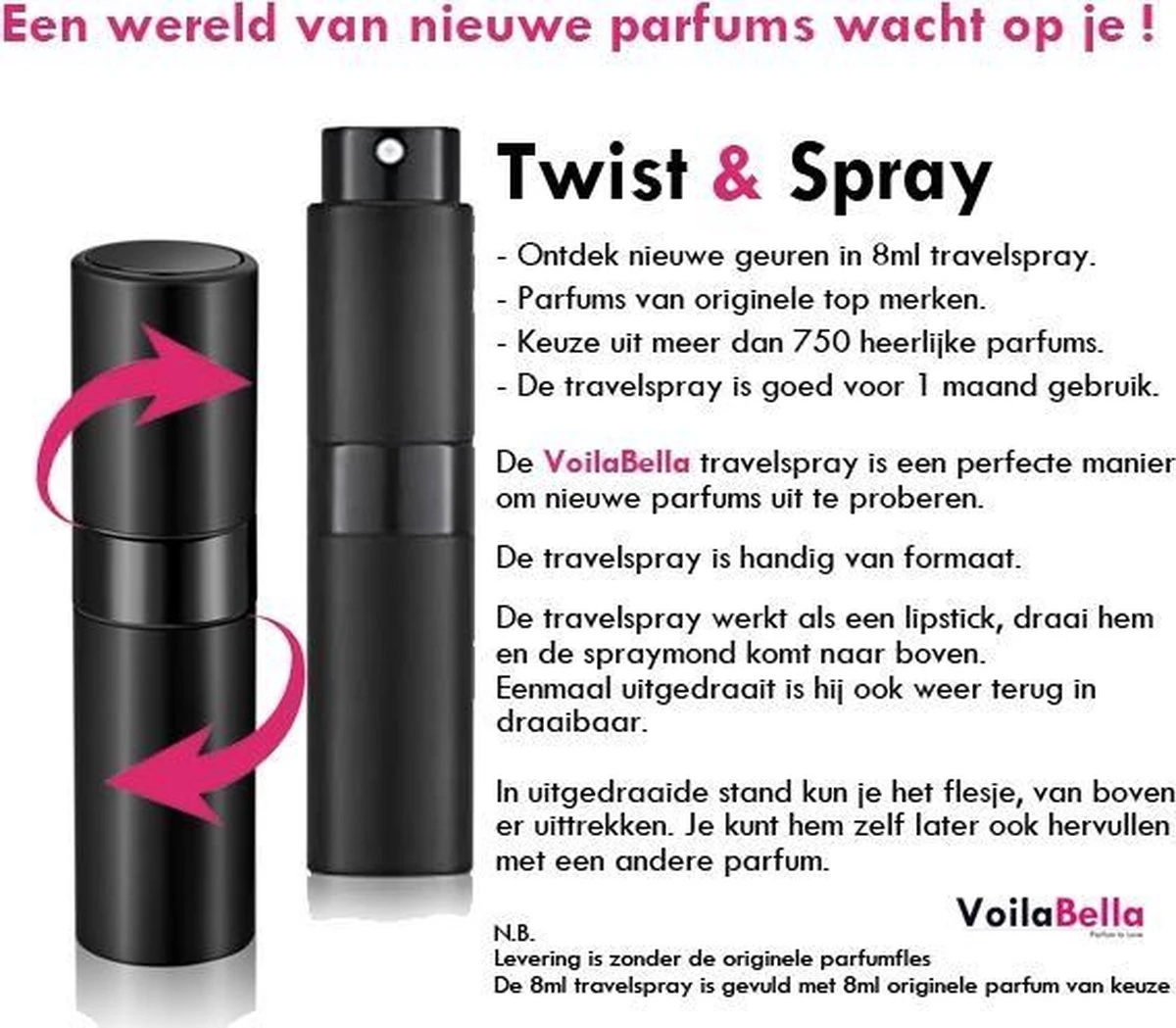 De travelspray is door ons afgevuld met 8ml originele parfum van jouw keuze.