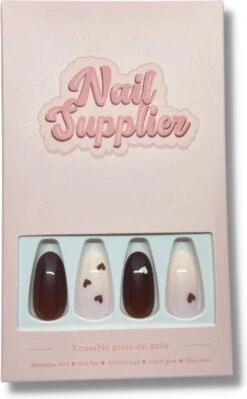 Nailsupplier ‘Hot Chocolate’ | WINTERCOLLECTIE | Bruine Nepnagels Met Hartjes Print | Plaknagels | Kunstnagels Met Lijm | Press On Nails